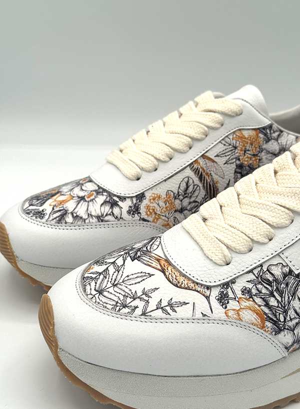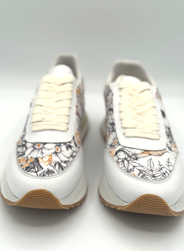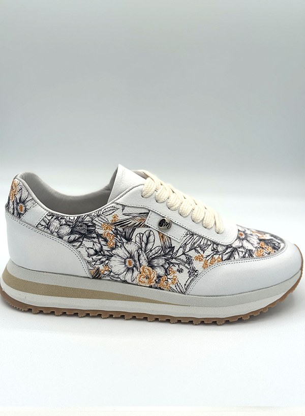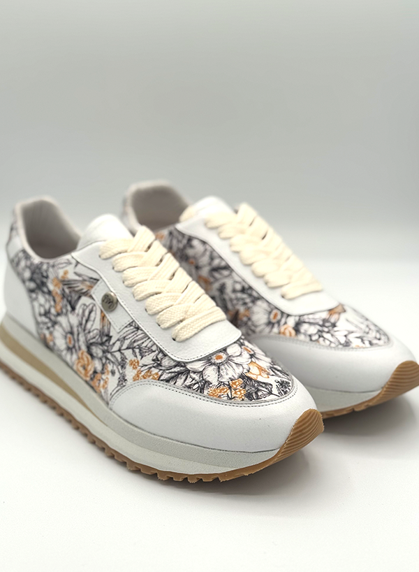 Este tenis blanco de estilo casual presenta un estampado floral detallado en tonos oscuros con toques de naranja o dorado, cubriendo gran parte de la capellada. Tiene cordones color crema y una suela de plataforma bicolor, con una capa superior gris claro y una base de goma color caramelo, ofreciendo un contraste suave y un diseño fresco.