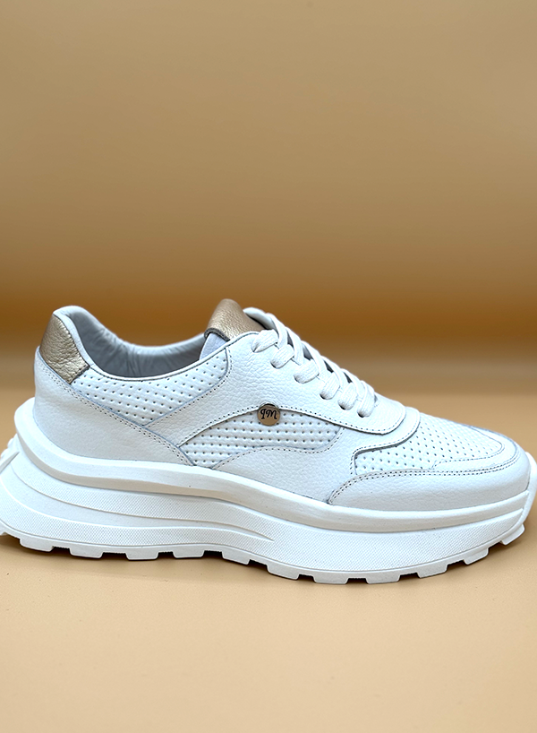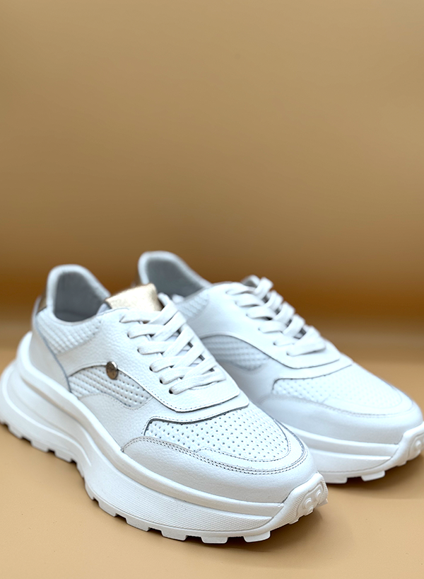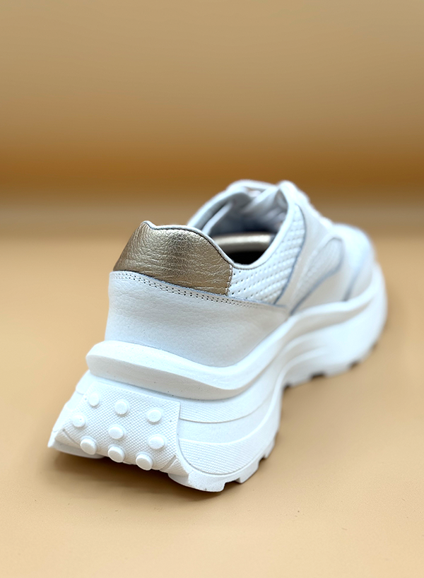 Este tenis de estilo deportivo en color blanco presenta una suela gruesa y texturizada que le da un aspecto robusto. La parte superior combina cuero liso con paneles perforados para transpirabilidad, y cuenta con un detalle metálico dorado en el talón, añadiendo un toque distintivo.